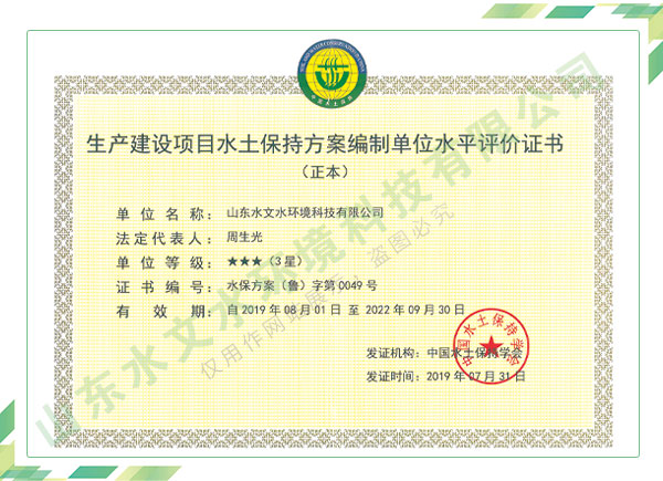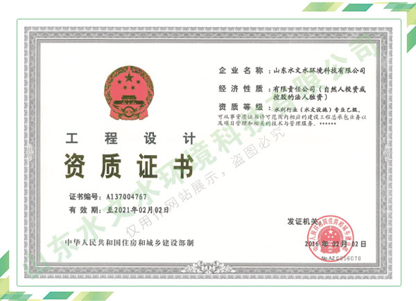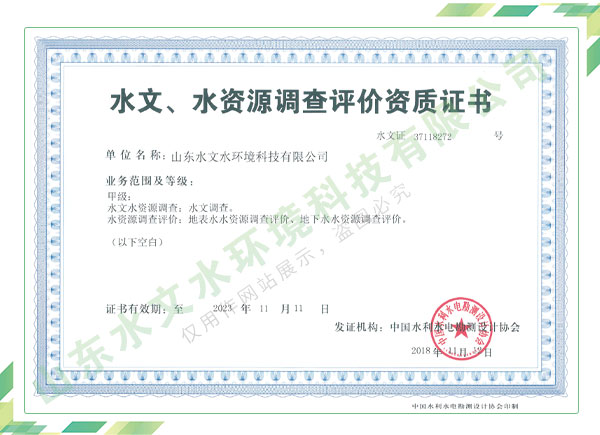 公司擁有水利工程設計、水土保持、水文水資源調查評價、水資源論證、建設項目環境影響評價、市政公用工程施工總承包、水利水電工程施工總承包、電子與智能化工程專業承包等資質,2017年通過質量管理體系、環境管理體系、職業健康安全管理體系認證;2020年被評為國家級高新技術企業,同年被中國水利企業協會推薦為第一批“合同節水服務企業”;2021年被山東省、濟南市評為 “專精特新”中小企業。業務范圍涉及水利工程設計;節水設計、改造、水平衡測試;山洪災害調查;城市水資源調查評價;建設項目水土保持方案編制、監測、驗收、水土保持規劃;水安全保障規劃、建設項目水資源論證、規劃水資源論證;建設項目環境影響評價;入河排污口論證;防洪影響評價;市政公用工程施工、水利水電工程施工、電子與智能化工程施工等。